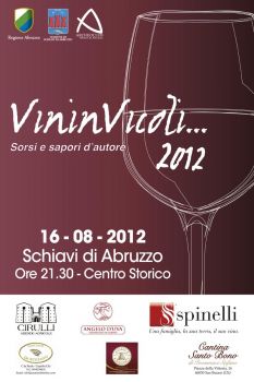 L’Archeoclub con il patrocinio della Regione Abruzzo e del Comune di Schiavi di Abruzzo (CH) propone una passeggiata enogastronomica con degustazione di prodotti tipici nostrani e non solo, accompagnata da ottimi vini, nella cornice offerta dai vicoli del centro storico. Una serata di cultura enogastronomica davvero da non perdere . Fino al 19 agosto presso la biblioteca comunale di Schiavi d’Abruzzo, sarà aperta la mostra personale di scultura di Giuseppe Colangelo.