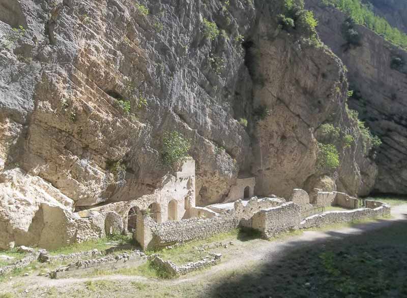 Il caldo e l’afa non accennano a diminuire, quindi se si vuole andare in montagna bisogna trovare ombra ed acqua. Questa volta ho scelto il percorso più lungo e con maggior dislivello per arrivare a Monte Amaro (2793 m),… ma non per percorrerlo tutto. Ho preventivato di tornare indietro alle ore 13, in qualsiasi punto mi trovavo. La partenza è da Fara san Martino (440 m),Ch. Fara è una parola di origine longobarda che individua un gruppo, costituito da famiglie imparentate. Occorre parcheggiare l’auto nell’area riservata lungo la carrareccia che porta all’imbocco del Vallone di Santo Spirito. Per entrare nella valle si attraversa uno stretto ed alto corridoio dove c’è sempre uno spiffero di aria fresca. La leggenda narra che fu fra Martino eremita che aprì con i gomiti lo stretto passaggio tra le rocce, per permettere agli abitanti del posto, di raggiungere i pascoli e le sorgenti a monte. In seguito si costruì il monastero di San Martino in Valle, distrutto dai Turchi e sepolto da dodici metri di detrito alluvionale, causa frane. Oggi è visibile il portale gotico con alcuni colonnati delle tre navate, riportati alla luce circa dieci anni fa. Come non contemplare questo monastero che trasmette sempre un senso di misticismo?