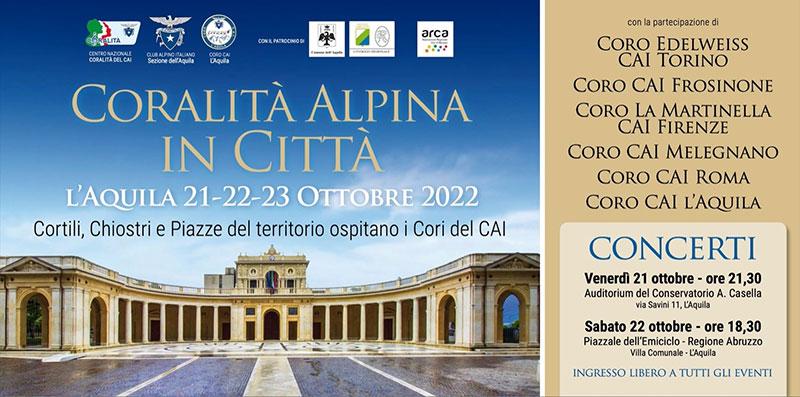 Il Centro Nazionale Coralità del CAI, la sezione CAI di L’Aquila ed il coro CAI L’Aquila, con il patrocinio della Regione Abruzzo e del Comune dell’Aquila, presentano la manifestazione che si terrà a L’Aquila il 21-22-23 ottobre 2022. Si inizierà venerdi 21 Ottobre alle ore 21.30 presso l’Auditorium del Conservatorio A. Casella, il Coro CAI dell’Aquila diretto dal M. Giulio Gianfelice aprirà il concerto nel quale si esibiranno il Coro “La Martinella” di Firenze ed il Coro CAI di Melegnano.