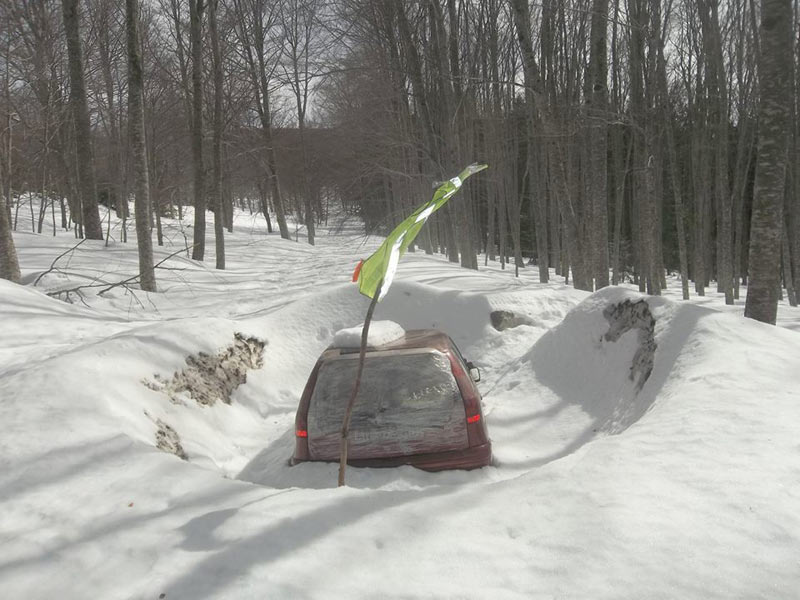 Il Piano di Taricaè una località che si trova a 1350 metri di altezza, fra i comuni di Lettomanoppello (Pe) e Serramonacesca (Ch), nel Parco Nazionale della Maiella. Offre varie possibilità sia per lo sci che per le escursioni, oltre all’ampio panorama sulle montagne e sul mare. La giornata molto ventosa con raffiche di vento violenti, ha reso difficoltoso sia sciare, anche perché i bastoncini da sci erano ingovernabili, e sia restare in equilibrio, quindi ho dovuto trovare zone sottovento o nel bosco. La neve è quella classica del periodo primaverile, umida ma scivolosa. Per mangiare la pizza con la mortadella ho trovato un grande masso che mi ha riparato dal vento e dal suo brontolio. Però, poco distante, uno sventolamento di un qualche cosa di colorato, ha attirato la mia attenzione. Devo andare a vedere … Incredulo, sbigottito, mi stropiccio gli occhi e cosa vedo? Dentro una buca c’era una vettura con la targa. Una riflessione ho dovuta farla…, come e perché la vettura si trovava in quella posizione, nel Parco Nazionale della Maiella? La tanta neve avrà reso impossibile di recuperarla, ma la targa sarà utile per conoscere il proprietario. Inutile fare le domande…ora sta lì. Scatto alcune foto, giro attorno, come verrà rimossa? In montagna ho trovato di tutto, soprattutto i rifiuti abbandonati da persone incivili che non rispettano l’ambiente, come materassi, frigoriferi, poltrone, plastica, ruote, ecc., ma una vettura, è la prima volta! Vado avanti, i colori si alternano velocemente per le nuvole ed il sereno. Come non restare stupiti per il panorama che va dal bianco dei monti all’azzurro del mare? Il bosco fatato fa immaginare i tholos coperti di neve ed una tana profonda di qualche animale selvatico mi incuriosisce.
