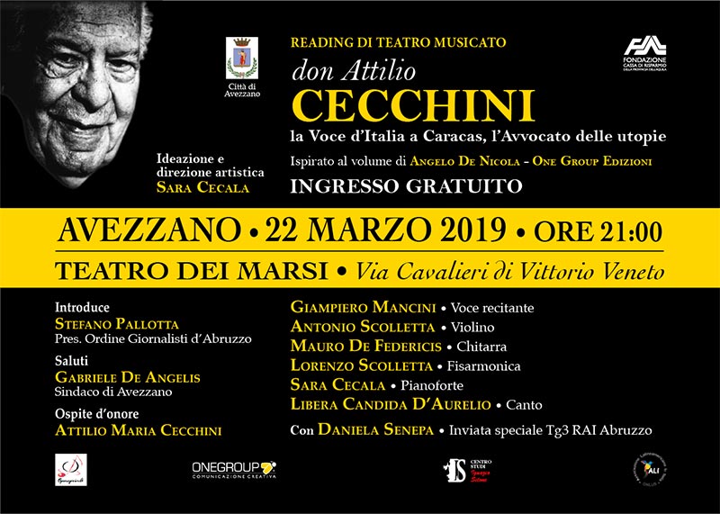 Venerdì 22 marzo, alle ore 21.00 andrà in scena al Teatro dei Marsi di Avezzano, dopo il successo della prima tenutasi all’Aquila lo scorso ottobre, lo spettacolo di teatro musicato dal titolo “Don Attilio Cecchini: la Voce d’Italia a Caracas, l’Avvocato delle Utopie”, ispirato al volume “Don Attilio Cecchini – Il giornalista di razza, il principe del foro, l’impolitico”, di Angelo De Nicola, pubblicato da One Group Edizioni.