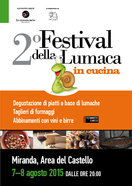 Il 7 e l’8 agosto alle 20.00, in occasione del 2° Festival della Lumaca,a Miranda, nell’area del Castello, si potranno gustare cinque diverse portate preparate sapientemente per far riscoprire un prodotto sano e naturale.