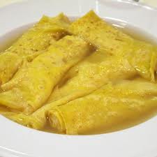 These very thin pancakes re prepared according to a recipe typical of the Teramo district. Prepare a mixture with 4 eggs, half a cup of milk, some chopped parsley, pepper and sale, then, little by little, add some flour to give it the right consistency. Pour 1 tablespoon of this mixture in a small frying pan with little oil, and prepare a thin pancake nice and coloured on both sides. Sprinkle the surface of all the pancakes with grated pecorino cheese, then roll them up. Arrange all the rolls in a large pan, pour 1 litre a half of chicken or beef broth into. Finish with abundant grated pecorino or parmesan cheese.