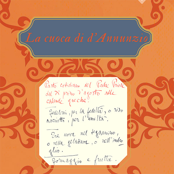 Un menù che richiama i piatti amati in vita da d’Annunzio, ispirato al libro “La cuoca di d’Annunzio”, di Maddalena Santeroni e Donatella Miliani, una raccolta dei biglietti del Vate alla sua “Suor Albina”. Il Vate si dimostra un poderoso organizzatore di cene, pranzi, delizie e scenografie studiate in modo da trasformare l’atto brutale e così volgarmente fisico dell’ingurgitare il cibo in un rituale elegante e sensuale.