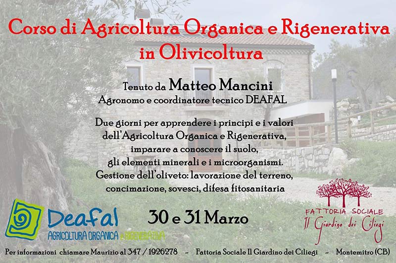 Il 30 e 31 marzo 2019 si terrà presso la Fattoria Sociale Il Giardino dei Ciliegi a Montemitro (Cb) il corso formativo di Agricoltura Organica Rigenerativa in Olivicoltura tenuto dall’agronomo Matteo Mancini coordinatore tecnico DEAFAL. Una due giorni per imparare a conoscere il suolo, la lavorazione del terreno, la gestione di un oliveto. Per informazioni e iscrizioni rivolgersi a  Maurizio al 347/1926278 Â
