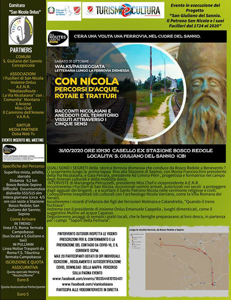Nell’ambito del bando “Turismo è Cultura” della Regione Molise, con capofila Comitato San Nicola Onlus in sinergia con i Comuni di San Giuliano del Sannio (CB) e Cercepiccola (CB) ed altri partner del Molise, del Lazio e di New York, il 31 ottobre e il 1 novembre 2020 si sono tenuti due eventi realizzati dalla rete progettuale A.E.N.R., l’Associazione Europea NikolaosRoute-La Via Nicolaiana®- European Route Nicholas of Myra®, (www.nikolaosroute-lavianicolaiana.com) l’Itinerario Europeo dedicato al Santo Nicola di Myra e Bari, cui ha aderito nel 2018 San Giuliano del Sannio. Il Progetto coniuga tradizione ed innovazione del culto nicolaiano locale, partendo dalla eccezionale figura degli storici Fucilieri di San Nicola, promuovendo attraverso modalità di turismo dolce e sostenibile, attività di marketing territoriale e l’adozione di nuovi strumenti social e tecnologici, il cultural heritage di San Giuliano del Sannio nella Valle del Tammaro, in rete anche con la città di New York e la comunità di emigranti molisani in USA. Il progetto, presentato in “Turismo è Cultura”, fonda le sue azioni di valorizzazione in chiave turistica del culto di San Nicola tra ieri e oggi a San Giuliano del Sannio e in USA, poiché nel 2021 è prevista l’inaugurazione a Ground Zero-New York della chiesa greco-ortodossa di San Nicola, progettata dall’architetto Santiago Calatrava come simbolo dei martiri nel mondo in nome della pace. In questo contesto mondiale diviene un importante contributo l’abbraccio secolare tra San Giuliano del Sannio ed i suoi emigrati, che perdura tutti gli anni attraverso la co-progettazione della festa patronale e l’assidua partecipazione dei molisani di seconda generazione nei luoghi natii. Luoghi di incredibile fascino ma anche di promettente potenziale turistico, da far proclamare il Molise al quotidiano americano New York, tra le 52 mete turistiche eccellenti da visitare entro dicembre 2020. Per la promozione italiana, le attività di marketing territoriale outdoor sono state inserite nel noto Meeting degli Itinerari,“All Routes lead to Rome “ sotto l’alto patrocinio del Parlamento Europeo, Ministeri e Regioni Italiane, Enit, Pontificio Consiglio della Cultura, Pastorale per il Tempo Libero Turismo e Sport della CEI.