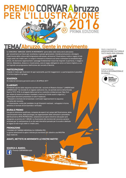 Corvara è un paesino dell’entroterra pescarese, nel secolo scorso spopolato dall’emigrazione. Da qualche anno, però, l’antico e suggestivo borgo rivive d’interesse, grazie alle iniziative messe in campo dall’Associazione culturale “Tutti pazzi per Corvara”.La più recente proposta è un Premio internazionale per l’illustrazione, in questa prima edizione dedicato al tema dell’emigrazione abruzzese, a fumetti, rivolto agli autori di comics di tutto il mondo. Il PREMIO CORVARAbruzzo per l’Illustrazione è infatti un’iniziativa ideata ed organizzata dall’Associazione culturale “Tutti pazzi per Corvara” in partnership con la Scuola Internazionale di Comics, con il Patrocinio del Consiglio Regionale d’Abruzzo, del CRAM (Consiglio Regionale Abruzzesi nel Mondo), dell’ANFE (Associazione Nazionale Famiglie Emigranti) e del Comune di Corvara. Il Premio è inoltre realizzato in collaborazione con il Museo delle Genti d’Abruzzo, la Fondazione “Edoardo Tiboni per la Cultura” ed il Mediamuseum, l’Agenzia di Promozione Culturale – Biblioteca “F. Di Giampaolo”, UD’ANET (University G. D’Annunzio New Enterprise Technology), l’Agenzia di comunicazione “Pomilio Blumm”, Ianieri edizioni, Casa editrice Menabò, #FLA Pescara Festival.